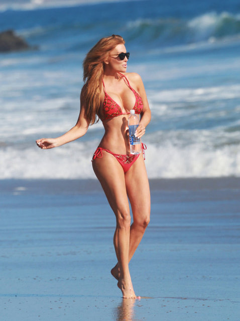 Dünyaca ünlü yıldız Angelica Bridges, bir su markası için 2 farklı kırmızı mayo ve bikinisiyle objektşf karşısına geçti.