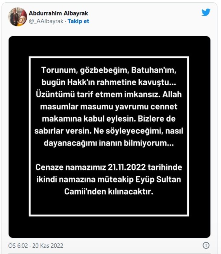 ABDURRAHİM ALBAYRAK ACI HABERİ SOSYAL MEDYADAN DUYURDU.